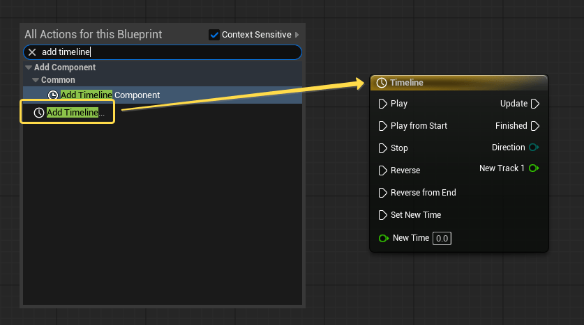 Timeline в Blueprint представлен в виде специального узла, который вызывается в Event Graph через правую клавишу мыши по команде Add Timeline.