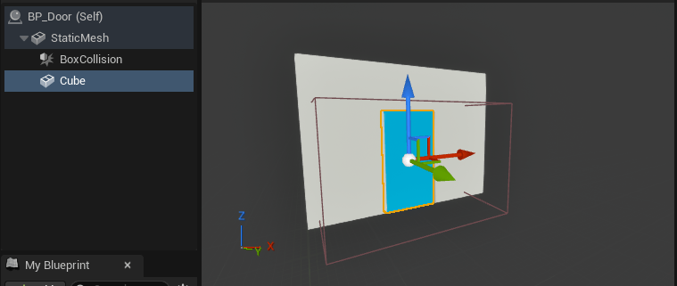 - Создадим простой Актор BP_Door, состоящий из стены с дверным проёмом, самой двери и коллизионного компонента Box Collision, определяющего зону взаимодействия.