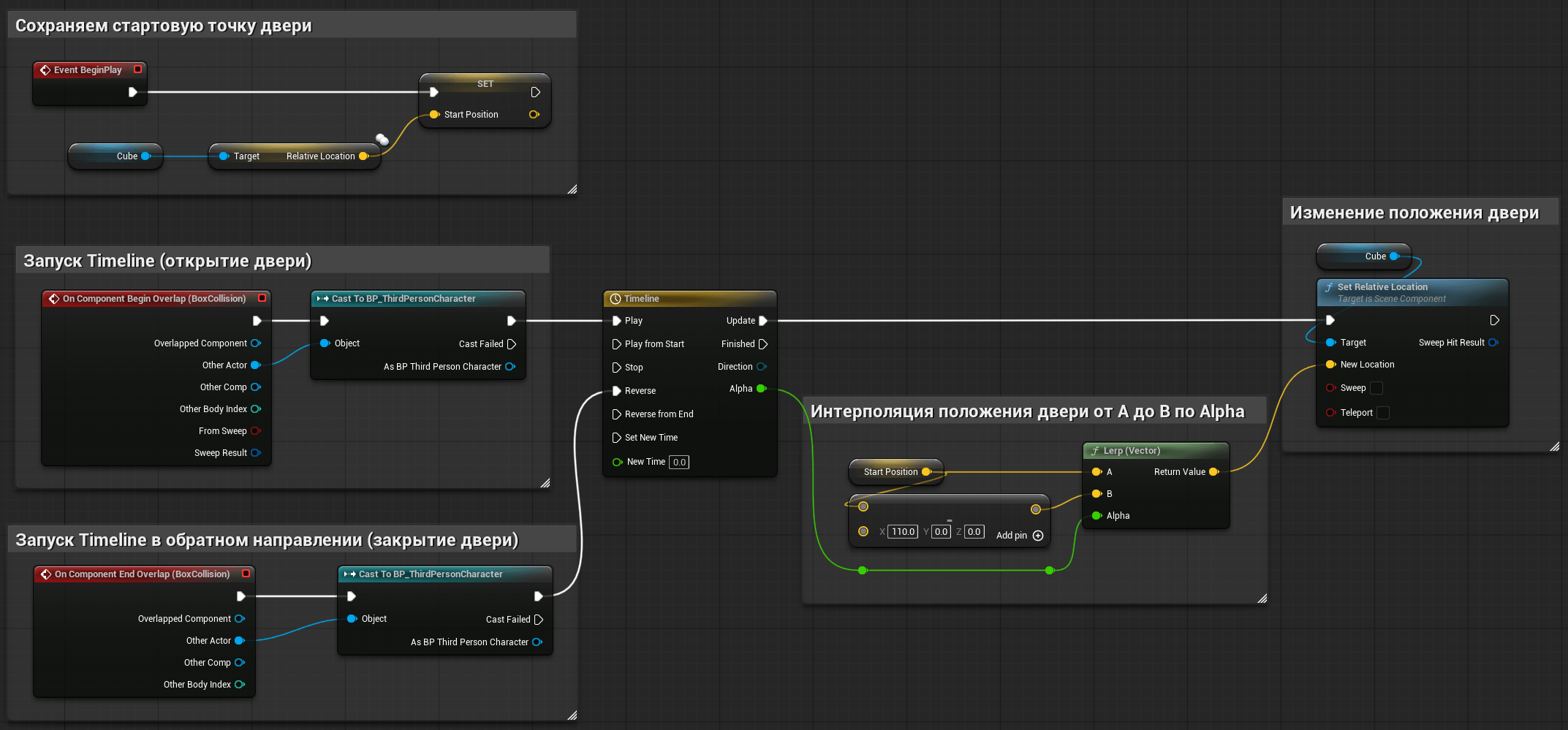 - Результат интерполяции подаём на вход функции Set Relative Location, которая изменит локальную позицию двери при каждом обновлении Timeline через выходной пин Update.