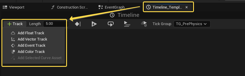 Как уже упоминалось выше, при двойном клике на узел Timeline в Blueprint открывается редактор дорожек (Tracks) для создания и настройки кривых. По умолчанию редактор пуст. Чтобы добавить новую дорожку, нажмите кнопку +Track. Появится список типов дорожек, из которых можно выбрать: