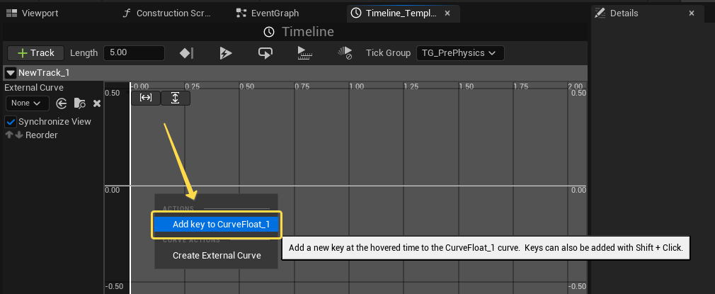 Для добавления ключевых точек (Key) к кривой кликните правой кнопкой мыши по области дорожки и выберите Add Key to CurveFloat (для float—дорожки). Аналогичные опции доступны и для других типов.