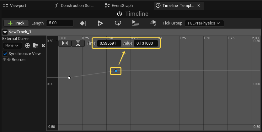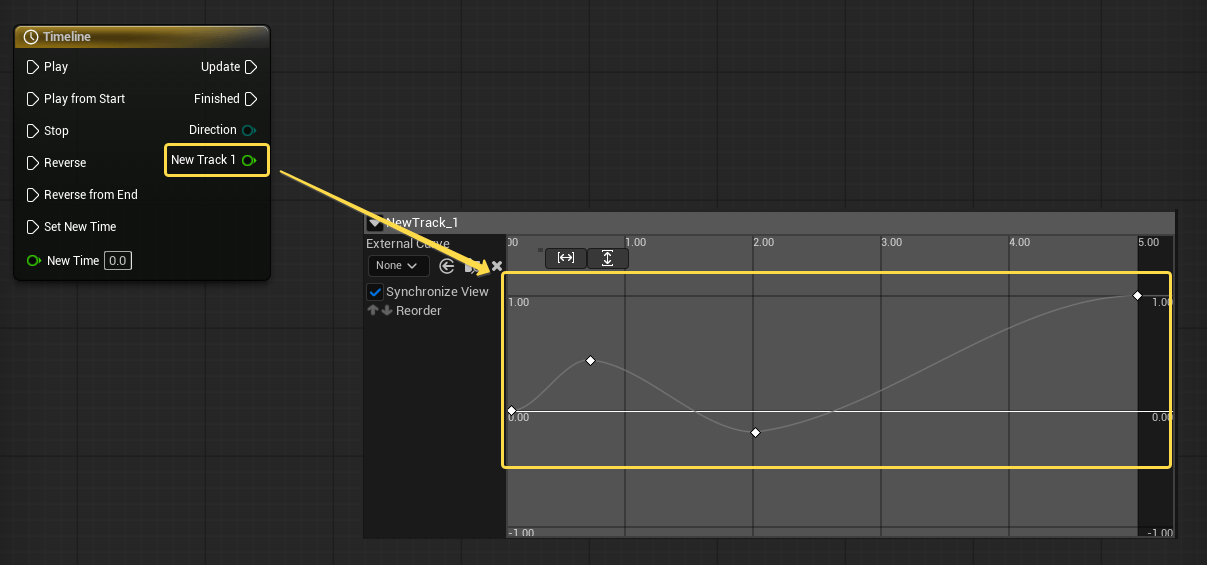 В результате внутри узла Timeline будет создана дорожка с заданной длительностью. Во время выполнения значения кривой доступны на выходном пине с именем, совпадающим с названием дорожки, что позволяет использовать эти данные для анимации, простого движения объекта или других целей.