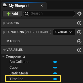Timeline можно настраивать не только через редактор Timeline Editor, но и динамически с помощью специальных узлов в Blueprint. Для этого необходимо получить ссылку на нужный Timeline: все созданные Timeline отображаются в панели My Blueprints в разделе переменных в категории Components.