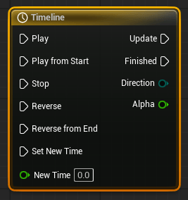 - Finished — сигнализирует о завершении воспроизведения Timeline (например, при достижении конца в прямом направлении или начала — в обратном). Остановка через Stop не вызывает этот пин.